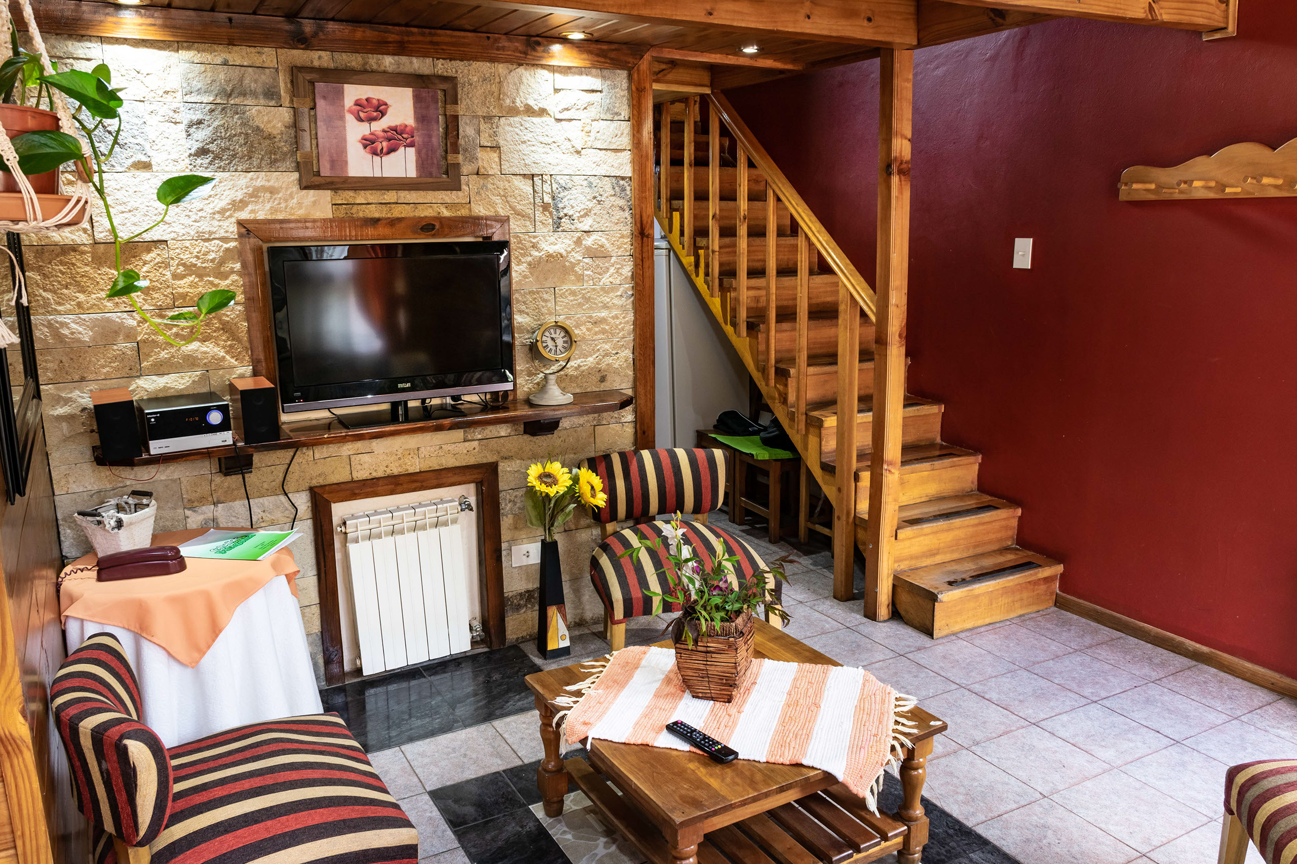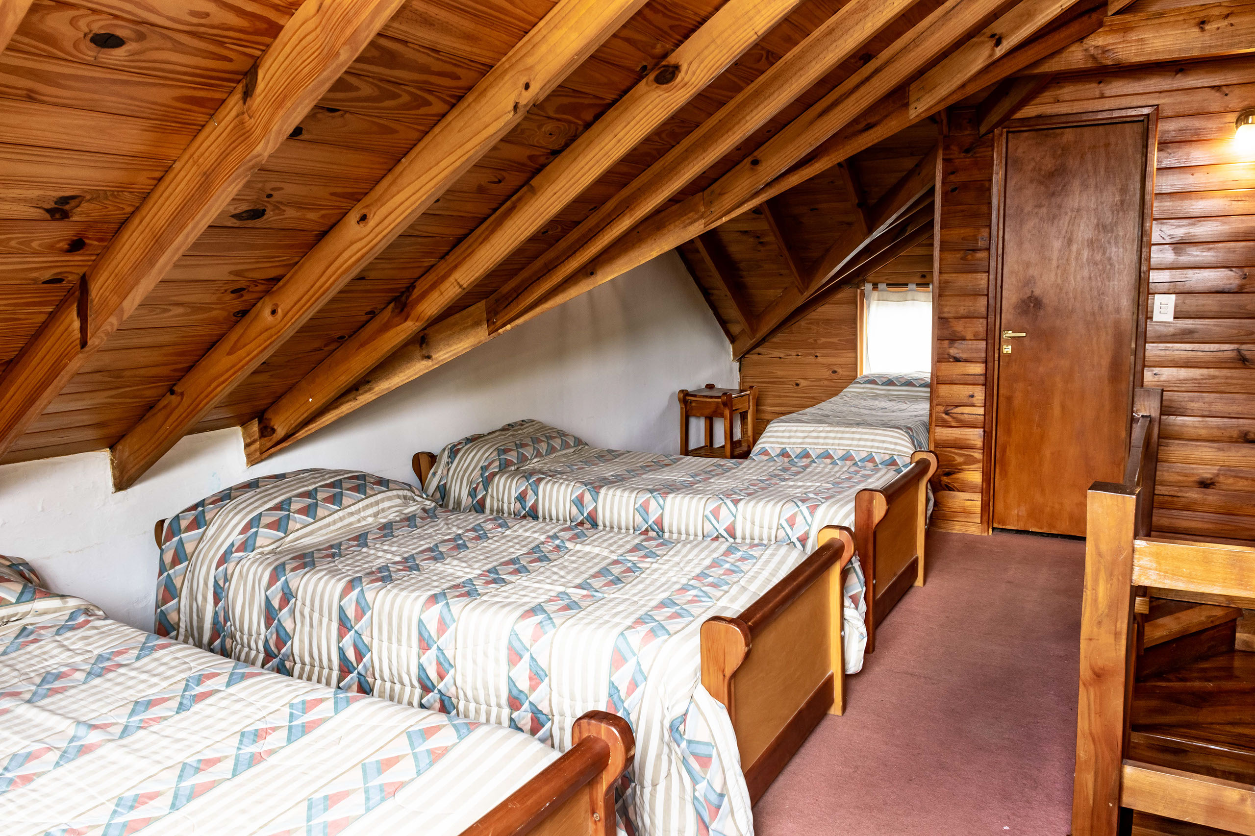 Todas nuestras cabañas poseen en planta baja un living que brinda un cálido ambiente para el relax, TV, teléfono, cocina comedor con todo el equipamiento y baño completo. En el primer piso, encontramos dos dormitorios, uno matrimonial (cama King) y otro con dos camas de una plaza, además de baño completo con bañera. En el caso de las cabañas mas grandes, hay un dormitorio muy amplio en segundo piso con camas simples.